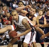 (Dan Pelle SR photo: Gonzaga’s Robert Sacre outrebounds St. Mary’s Rob Jones Thursday)