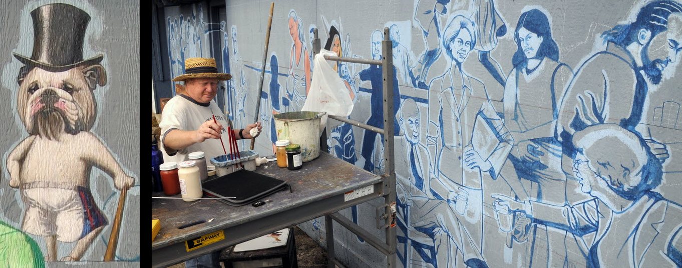 Two sections of Quinn’s wall mural at the business will not remain or have already been removed. The first is the curious portrait of a bulldog with a top hat (above, left image) that was on the wall for awhile, then removed.