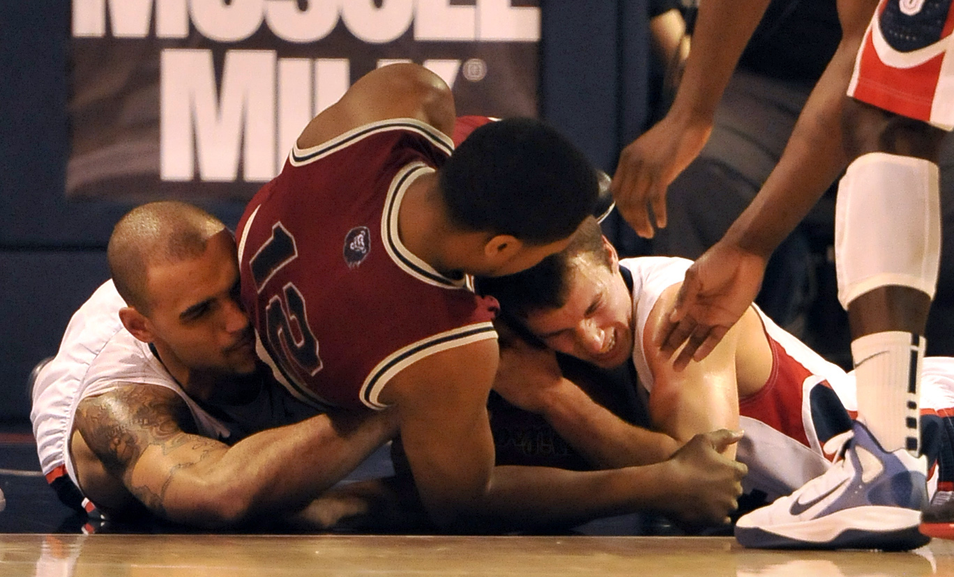 Gonzaga’s Kevin Pangos, right, holds on to the ball as he fights with Loyola Marymount’s LaRon Armstead, center, and teammate Robert Sacre, left, until the ref blows the whistle for a held ball tonight at McCarthey Athletic Center.
