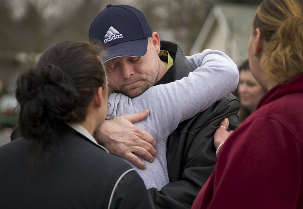 After a candlelight vigil outside his home at 4411 N. Whitehouse, Spokane, Nick Ader, whose wife and two sons were murdered Friday, is consoled by friends Sunday Afternoon. Story here. (SR photo: Colin Mulvany)