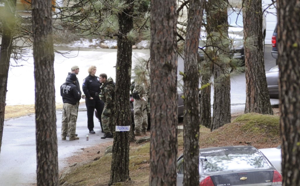 Spokane police gather at 909 W. Hazard Rd. were the body of Dustin Gilman was discovered near a rocky outcrop on the property Monday. (SR photo: Colin Mulvany)