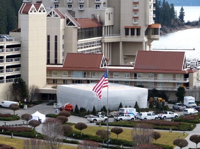 Photographer Don Sausser writes of the remodeling occurring at the Coeur d’Alene Resort entrance & beyond today: “The resort’s entrance canopy appears as large plastic wrapped gift during it’s update.”