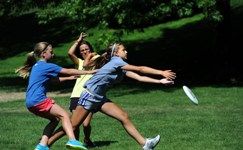 (Kathy Plonka SR file photo: Eleven-year-old Erika Boifeuillet (cq), left, Lauren Trueblood, 11, center and Alex Boifeuillet, 13, battle for the Frisbee at McEuen Field in August 2011)