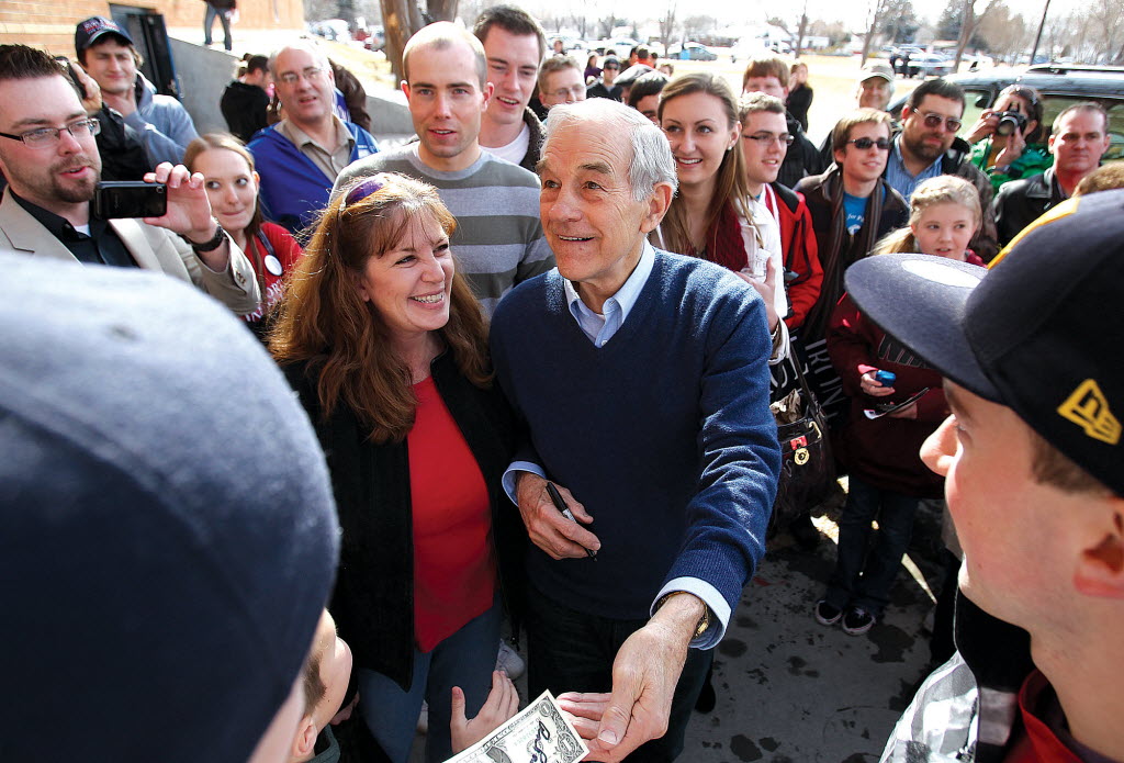 Republican presdential hopeful Ron Paul greets supportors on Thursday after giving a speech at Twin Falls High School in Twin Falls. 1,200 people attended the political rally at the school. Twin Falls Times-News story here. (AP Photo/Times-News, Ashley Smith)