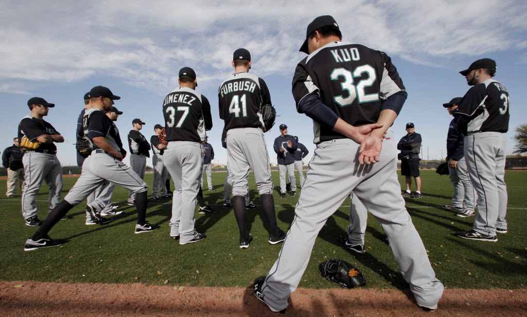 Pitchers, including Hong-Chih Kuo, (32), from Taiwan, listen to instructions from Seattle Mariners pitching coach Carl Willis, center, during spring training baseball, Tuesday in Peoria, Ariz. (AP Photo/Charlie Riedel)