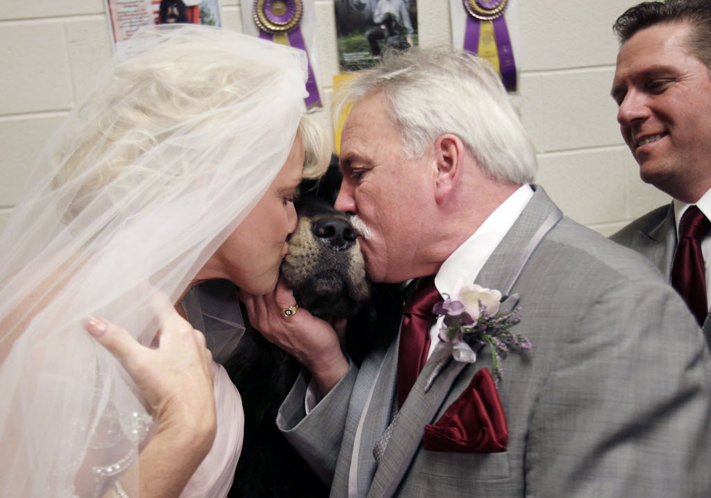 Debbie Parsons, left, and Brad Slayton kiss their dog, a Tibetan mastiff named Major, after they were married at the 136th annual Westminster Kennel Club dog show in New York on Valentine’s Day. Best man Tony Carter looks on at right. Carter is the Major’s handler and Major won Best in Breed this year at the dog show. (AP Photo/Seth Wenig)