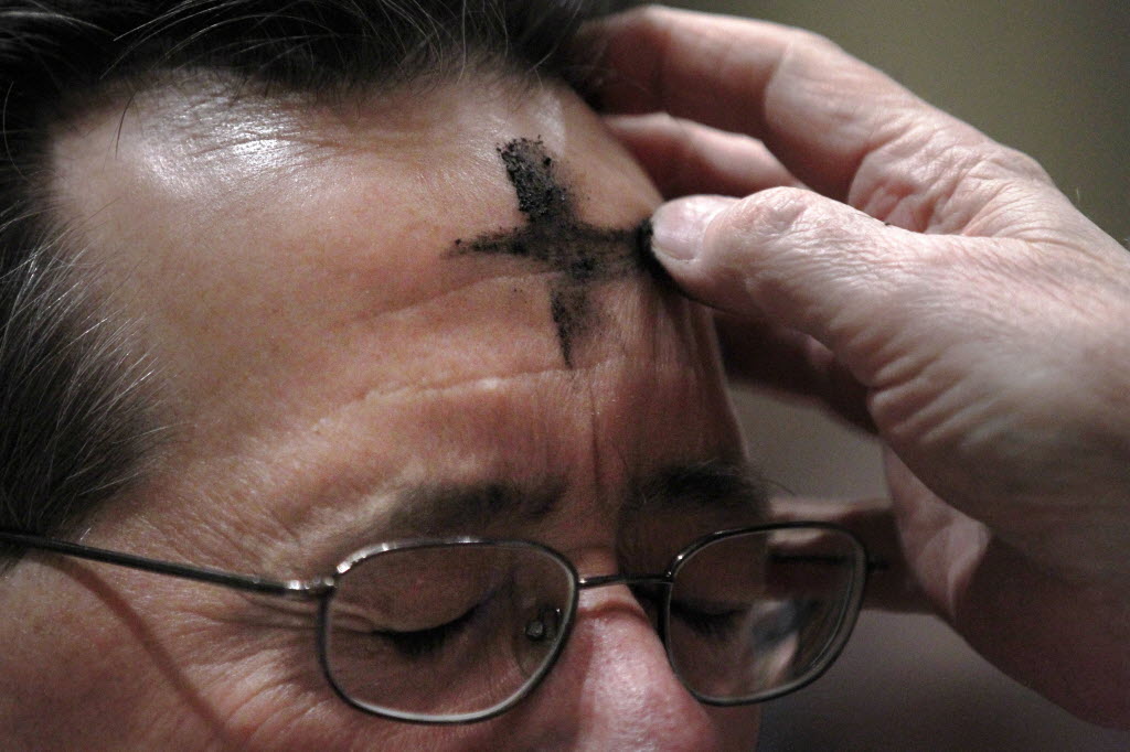 Monsignor Arthur Rodgers, rector of the Cathedral Basilica of Saints Peter and Paul, places ash on a worshiper’s forehead during an Ash Wednesday Mass at the cathedral in Philadelphia earlier today in Philadelphia. Ash Wednesday marks the beginning of Lent, a time when Christians prepare for Easter through acts of penitence and prayer. (AP Photo/Matt Rourke)