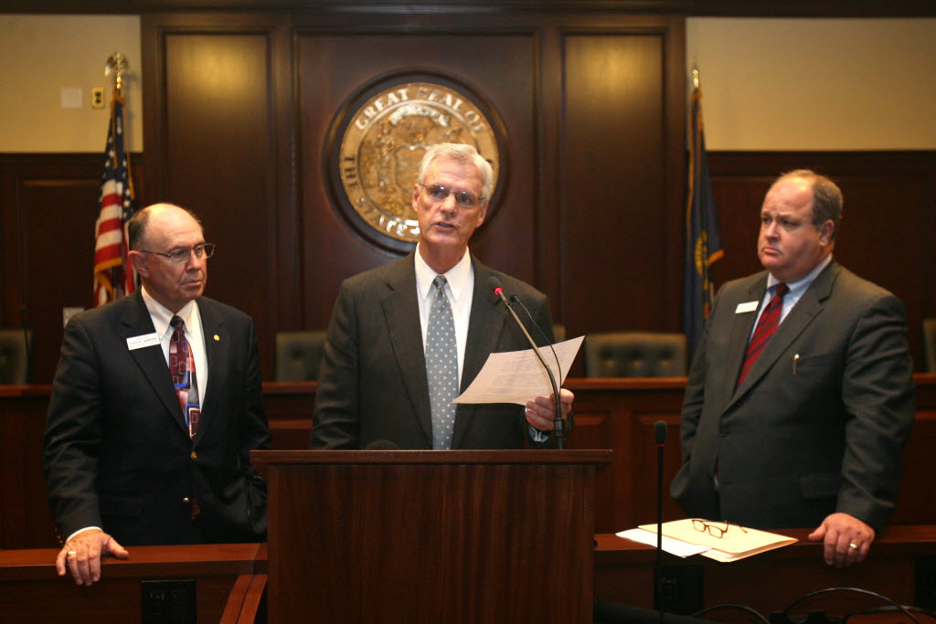 Idaho State senate leadership, Chuck Winder, left, Brent Hill, center, and Bart Davis announce the resignation of Sen. John McGee during a press conference earlier today at the Idaho Statehouse in Boise, Idaho. Faced with sexual harassment allegations, Republican Sen. John McGee was given two choices: Quit or go before a state Senate ethics panel. The 38-year-old four-term lawmaker opted to resign on Wednesday, capping a political free-fall that began last year with a Father’s Day drunken driving and car theft arrest. Roundup of stories about resignation here. (AP Photo/The Idaho Statesman, Chris Butler)