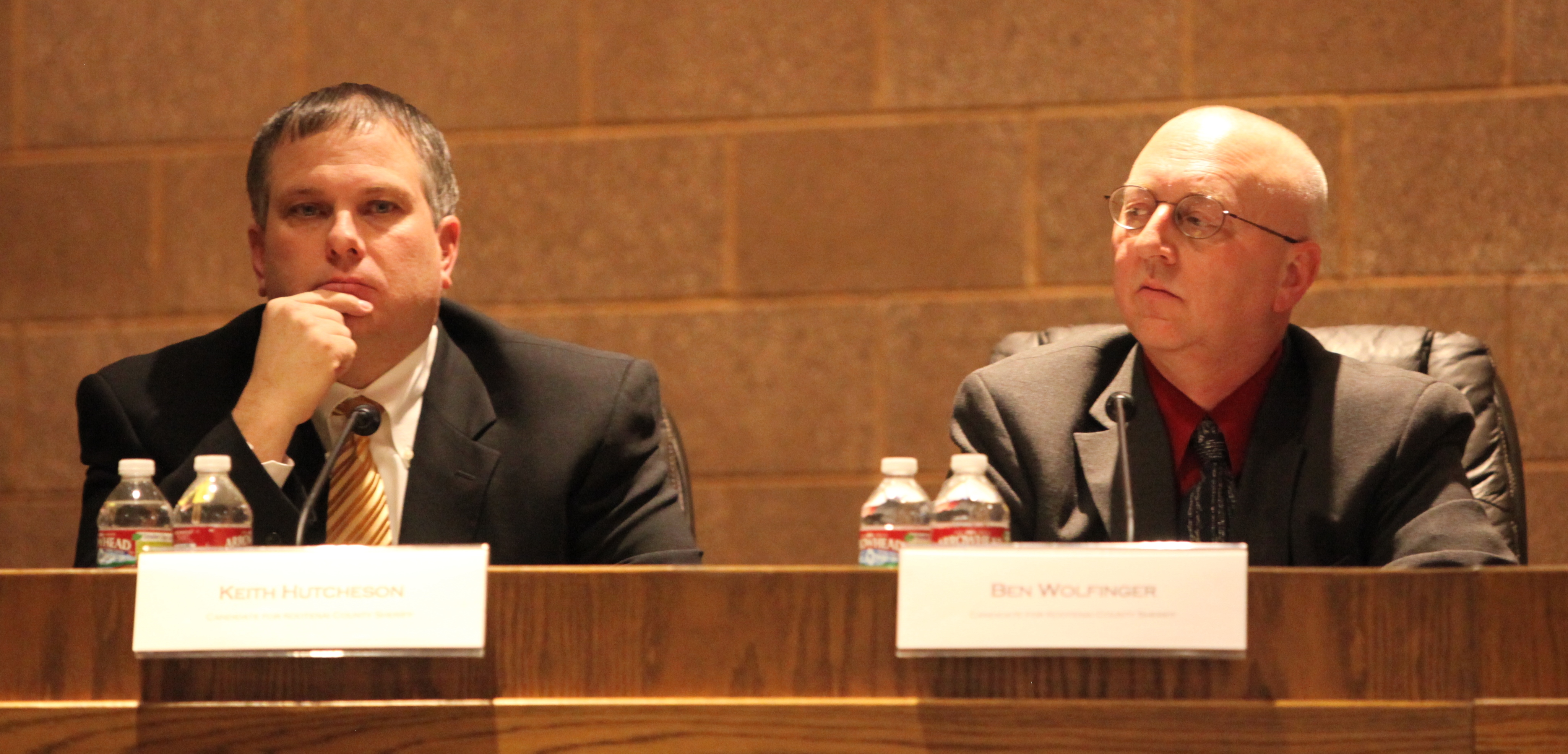 Keith Hutcheson, former Coeur d’Alene Tribal Police chief (left), and sheriff’s Major Ben Wolfinger mull a question at the candidates forum for the Kootenai County Republican sheriff’s nomination at Coeur d’Alene Library Wednesday night. I consider these two the most qualified of five-man field.