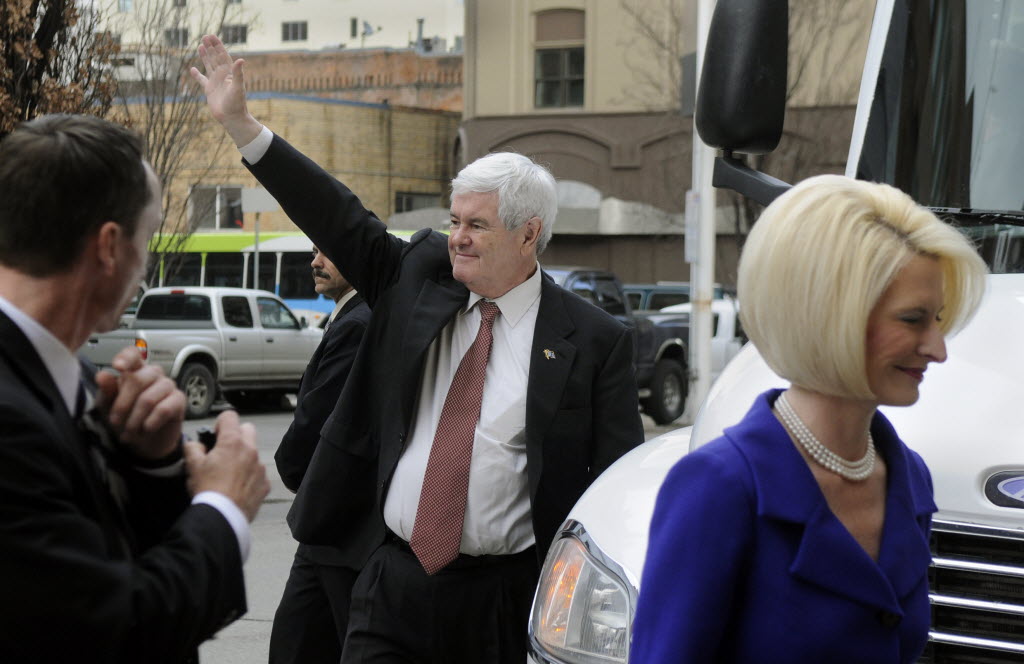 Newt Gingrich and his wife, Callistra, arrive at the Bing Crosby Theater for a rally Spokane this afternoon. Picture story here. (SR photo: Dan Pelle)