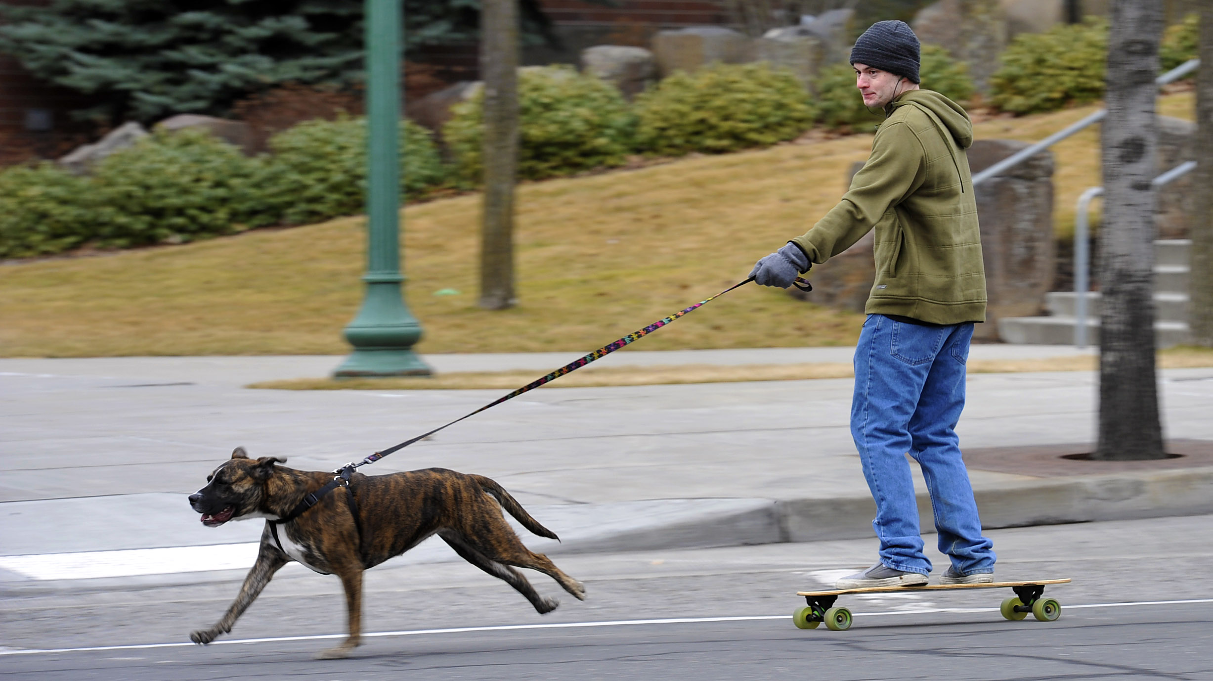 Reilly Smith, of Spokane, is taken for a ride, along Howard Street in front of the Spokane Arena, by his dog Chloe on Friday. Smith says he travels with the dog from Foothills Drive to Riverfront Park and then back home. Chloe still has energy after the long run. “I’ve created a monster” Smith said. (SR photo: Dan Pelle)