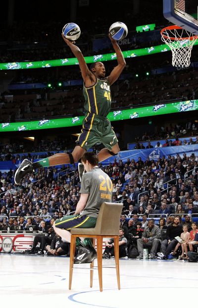 Utah Jazz’s Jeremy Evans jumps over teammate Gordon Hayward for his attempt during the NBA basketball All-Star Slam Dunk Contest in Orlando, Fla., Saturday. Evans earned 29 percent of 3 million text message votes cast by fans to win the competition. (AP Photo/Lynne Sladky)