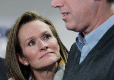 (AP photo: Karen Santorum lists to her husband talk to the media in Grand Rapids, Mich.)