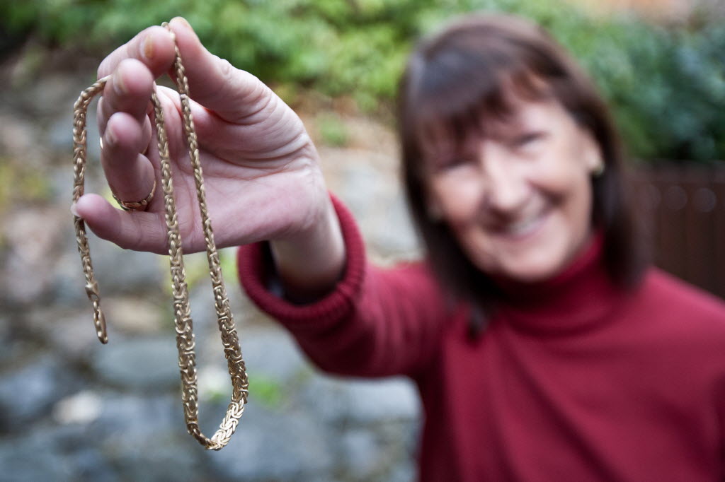 Ann Aulakh holds up her necklace at her home in San Rafael, Calif., on Sunday. Aulakh has her gold necklace back months after she accidentally flushed it down her toilet. San Rafael sanitation district employees were performing routine cleaning work on a pipeline last month when they came across Ann Aulakh’s necklace. AP Photo/Marin Independent Journal, Meghan Roberts)