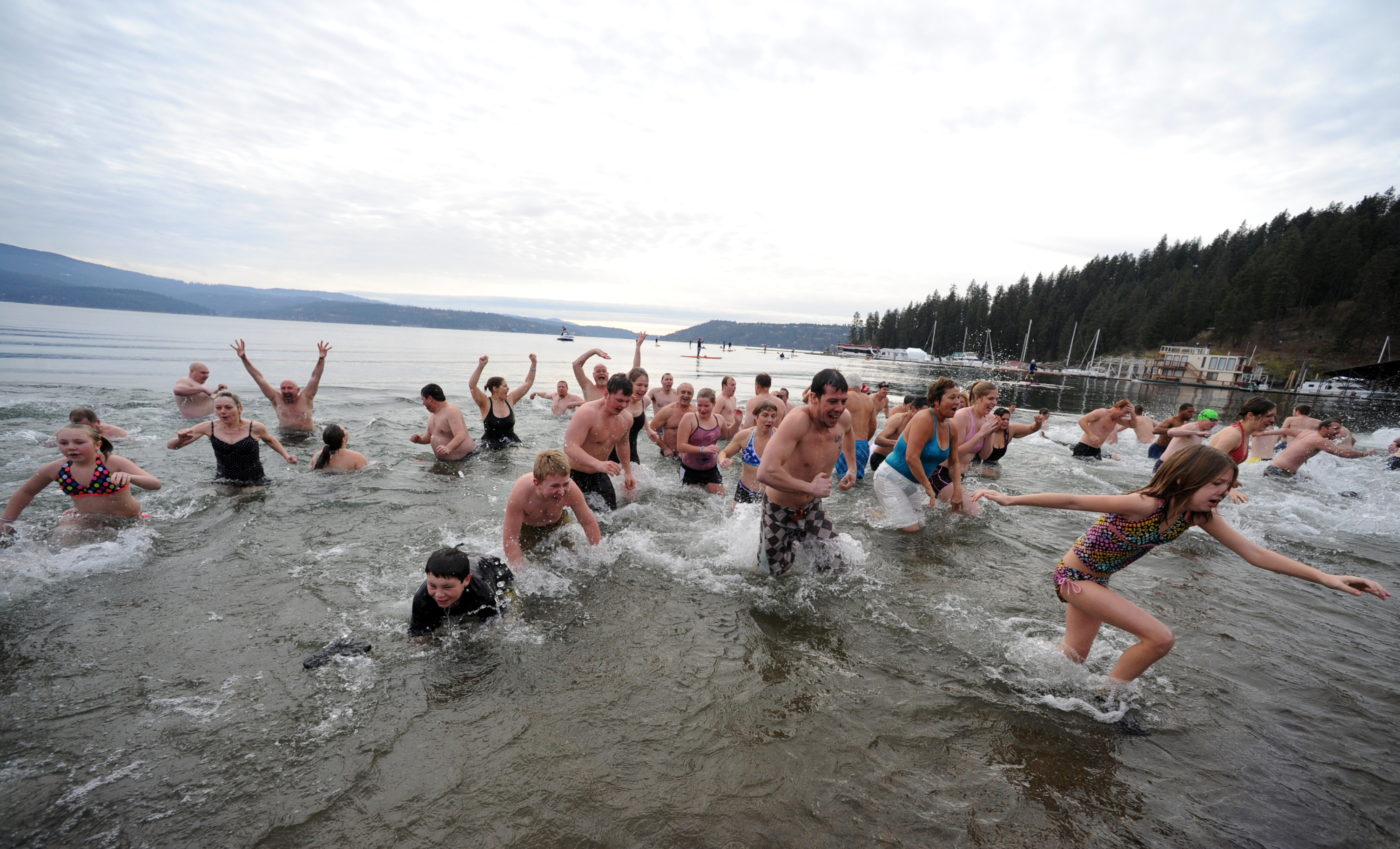 Plungers young and old dash out of, as quickly as they rushed into, the chilly waters of Lake Coeur d’Alene Sunday during the annual Polar Bear Plunge at Sanders Beach. The informally organized event started with a few friends making the jump to more than 1000 people crowding the beach to swim or to watch. (SR photo: Jesse Tinsley)