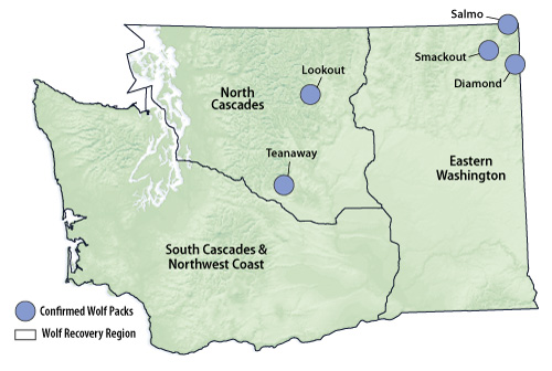 Under the recently adopted Washington wolf conservation and management plan, wolves will be removed from the state’s endangered species list once 15 successful breeding pairs are documented for three consecutive years among three wolf-recovery regions (four pairs in Eastern Washington, four pairs in North Cascades, four pairs in South Cascades/Northwest Coast, and three pairs in any recovery region).