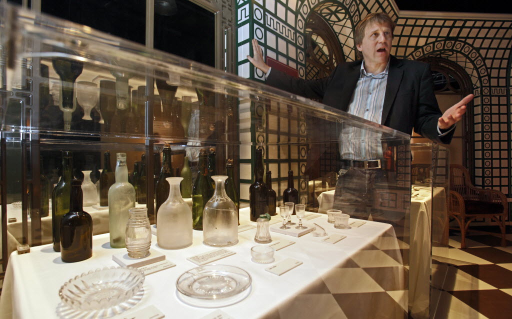 John Zaller, creative director of Premier Exhibitions, discusses objects from the Titanic’s Verandah Cafe on display in the “Titanic: The Artifact Exhibition” at the Discovery Times Square Exposition in New York, in this 2009 file photo. The owner of the largest trove of artifacts salvaged from the Titanic is putting the vast collection up for auction as a single lot in 2012, the 100th anniversary of the world’s most famous shipwreck. Story here. (AP Photo/RMS Titanic, Inc., a subsidiary of Premier Exhibitions, Inc.)