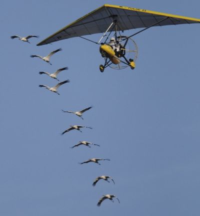 Operation Migration ultralight pilot Joe Duff led 10 juvenile whooping cranes from Wisconsin to their wintering habitats at Chassahowitzka and St. Marks National Wildlife Refuges along Florida’s Gulf Coast. You write the cutline. (AP Photo/The Birmingham News, Hal Yeager)