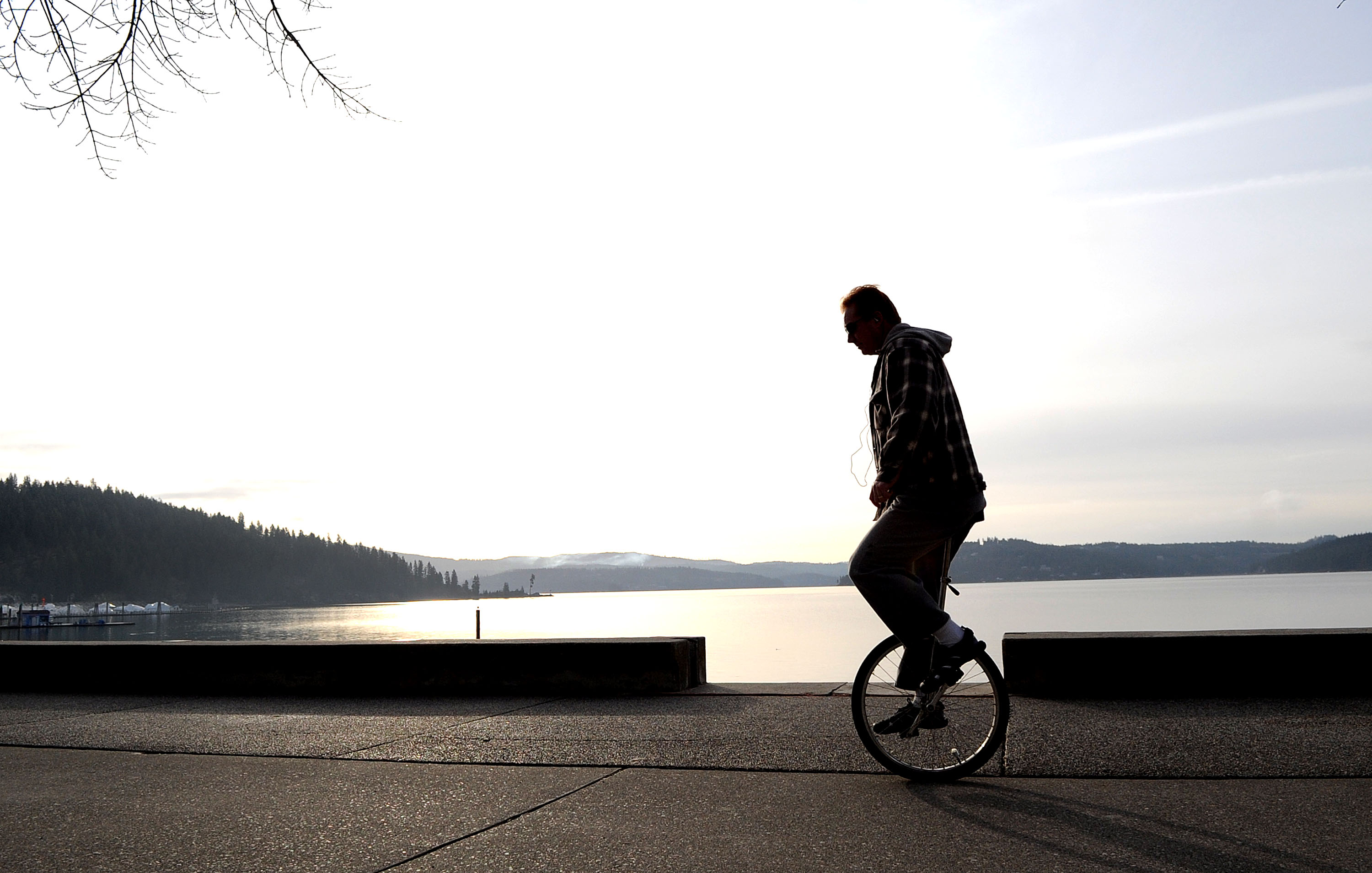 “I do this to strengthen my core muscles” said David Kopf, as he rode his unicycle through City Park in Coeur d’Alene on Friday. (SR photo: Kathy Plonka)