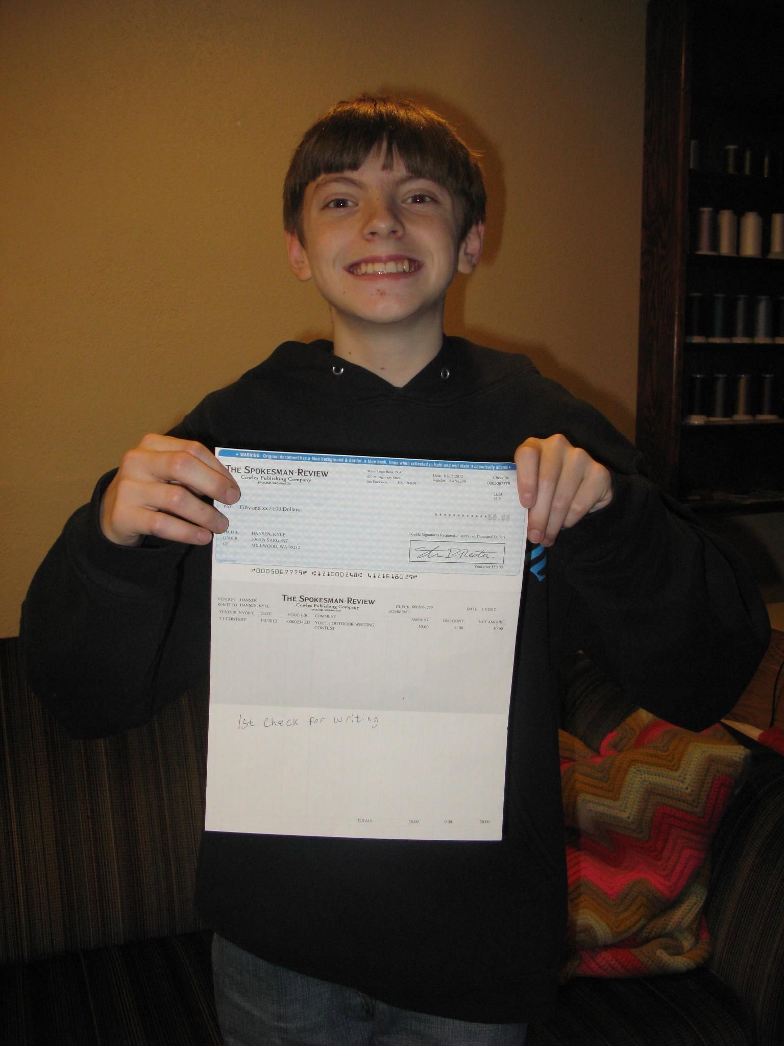 OUTDOORS — Kyle Hansen, a sophomore at West Valley High School, received his first check for writing outdoor prose on Saturday. You can see he wasn’t disappointed in this photo from his parents.