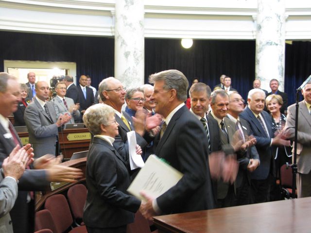 Gov. Butch Otter was greeted with a standing ovation as he entered the House chamber, shaking hands with lawmakers as he went. House Speaker Lawerence Denney told Otter, “The House and the Senate have both agreed that this will be a very short session.” Responded Otter, “Sounds promising already.”