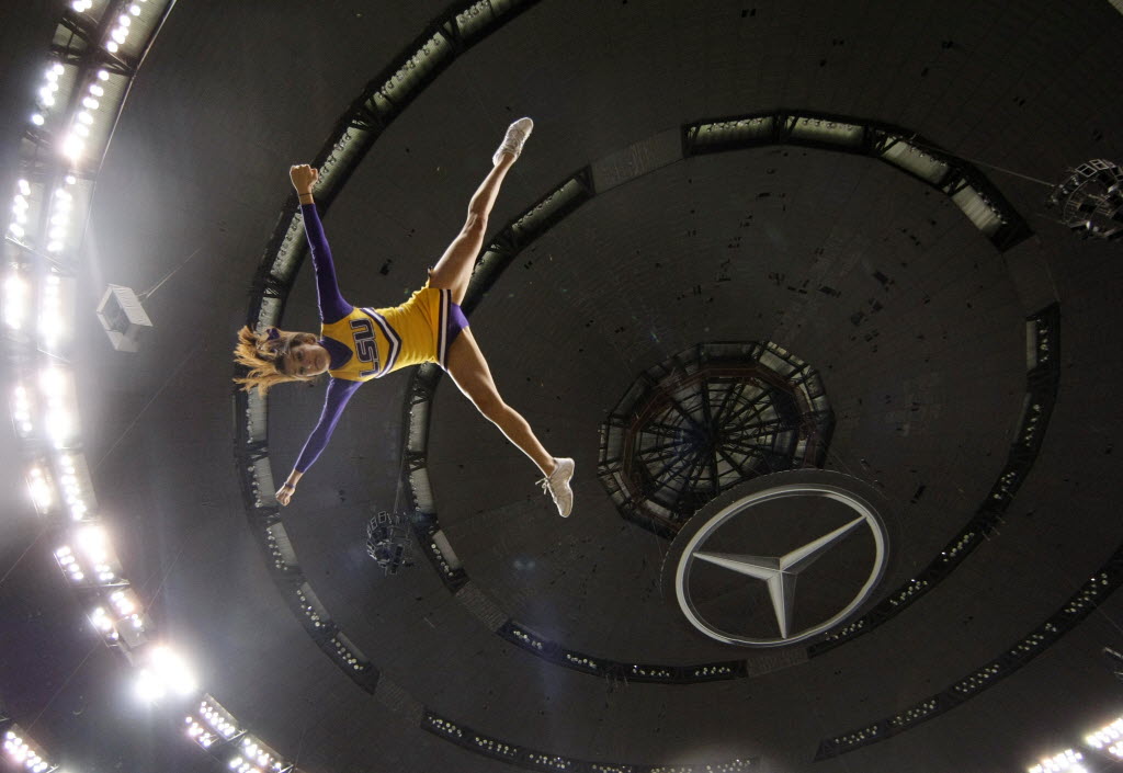 An LSU cheerleaders is flipped before the BCS National Championship college football game against Alabama Monday in New Orleans. (AP Photo/Gerald Herbert)