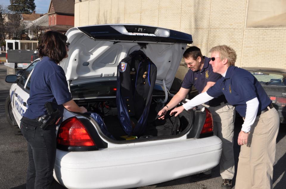 (from left) Spokane police Officers Shaney Redmon, Ron Tilley and Mylissa Coleman prepare to travel to Tacoma for a slain park ranger’s memorial service. (SPDphoto/Jennifer DeRuwe)