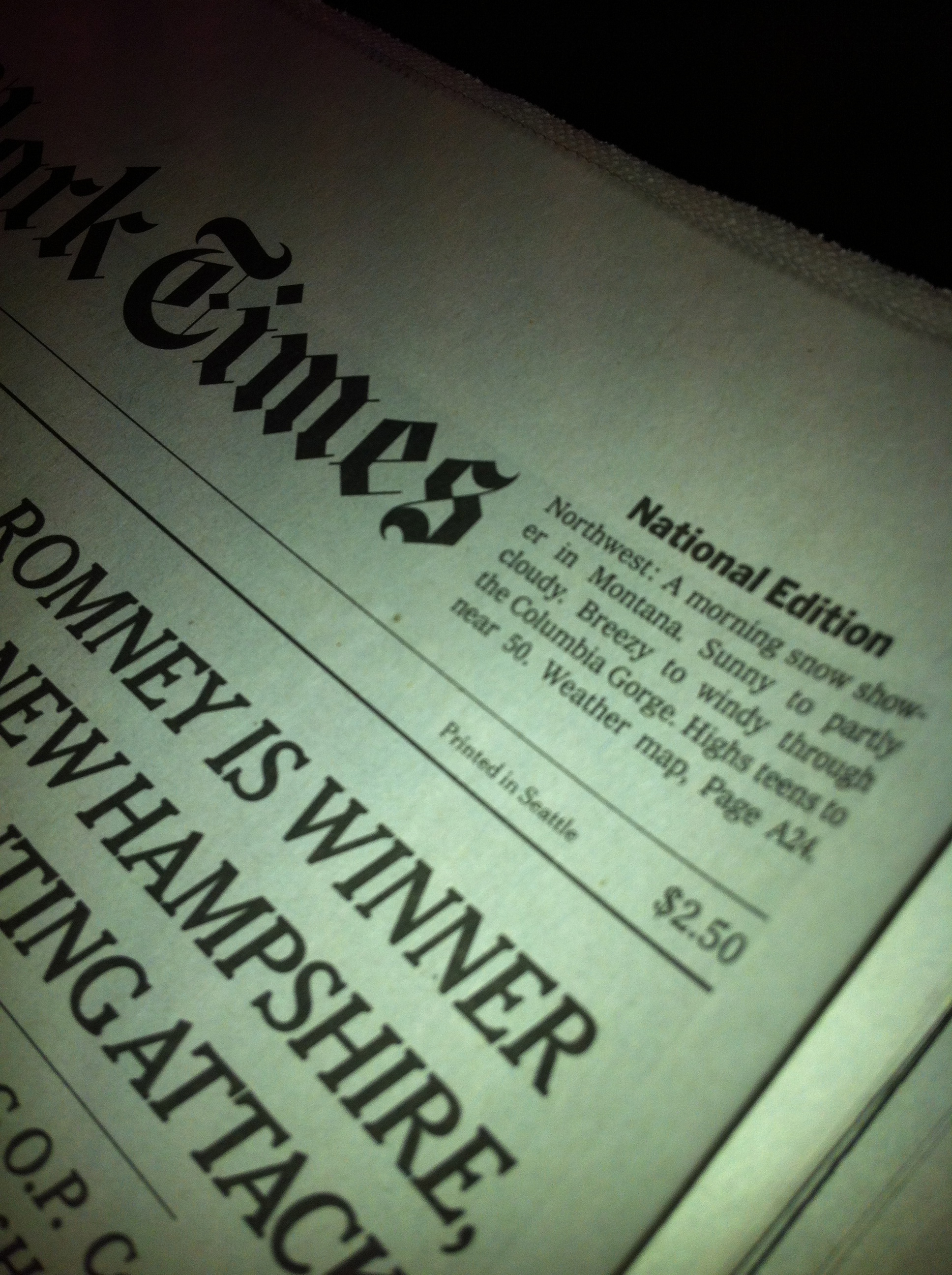 No one is a bigger fan of the New York Times than my wife. In an era that sees more and more people reading their news on computers, tablets or even their phones, she has remained true to the NYT’s print edition. Until recently, that is. If you look at the attached photo, you’ll see the purchase price: $2.50.