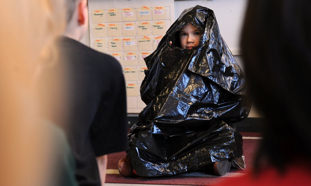Sorensen Magnet School third-grader Lauren Baldeck demonstrated ways to keep warm and dry in the wilderness during the Hug A Tree program at the school in Coeur d’Alene on Wednesday. The program, offered through the Kootenai County Sheriff’s Office, teaches participants the importance of staying put and surviving until search-and-rescue personnel arrive. (SR photo: Kathy Plonka)
