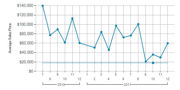 This chart provided via the CoreLogic website is a snapshot of sale prices for foreclosed homes in Spokane County over the last two full years, ending in December 2011. The extremely low prices in late December are skewed by the relative scarcity of home sales at that point.