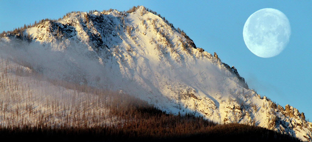 In a Wednesday morning, a full moon sets over the Bitterroot Mountain ridge that some call Kootenia Crags, just north of St. Mary’s Peak, Montana. (AP Photo/The Ravalli Republic, Perry Backus)
