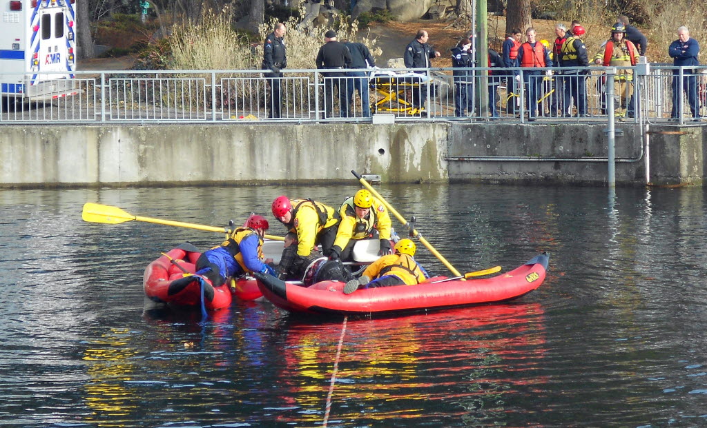 Crews rescued a man from the Spokane River in Riverfront Park today. The man was pulled from the river about 12:20 p.m. after rescuers responded to reports of a man hanging onto a rope in the water west of the Looff Carrousel, said Spokane Fire Chief Bobby Williams. Story & photo by Meghann Cuniff/SR here.