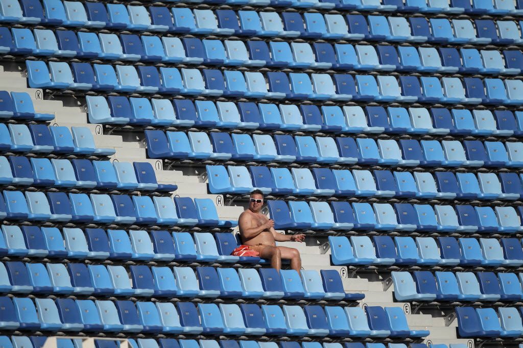 A cricket fan sunbathes as he watches England play Pakistan during the third day of the first cricket test match of a three match series between England and Pakistan at the Dubai International Cricket Stadium in Dubai, United Arab Emirates, earlier today. You write the cutline. (AP Photo/Hassan Ammar)