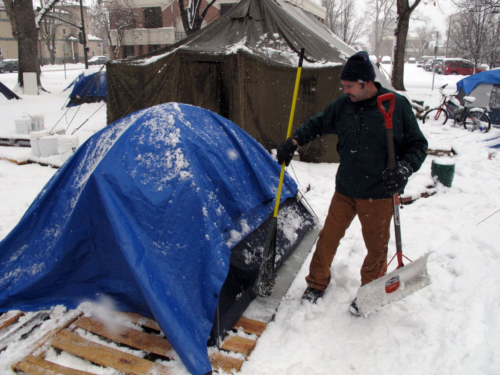 Scott Knight, a supporter of the Occupy Boise movement,shovels snow from the tent encampment on Wednesday. About two dozen supporters of the Occupy movement have erected tents on state property across from the Capitol. (AP Photo/John Miller)