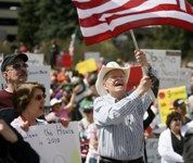 (AP file photo: Roger Warrick, 71, from Boise, waves his flag on the state capitol steps in downtown Boise during a Tea Party Boise tax day rally on April 15, 2010)