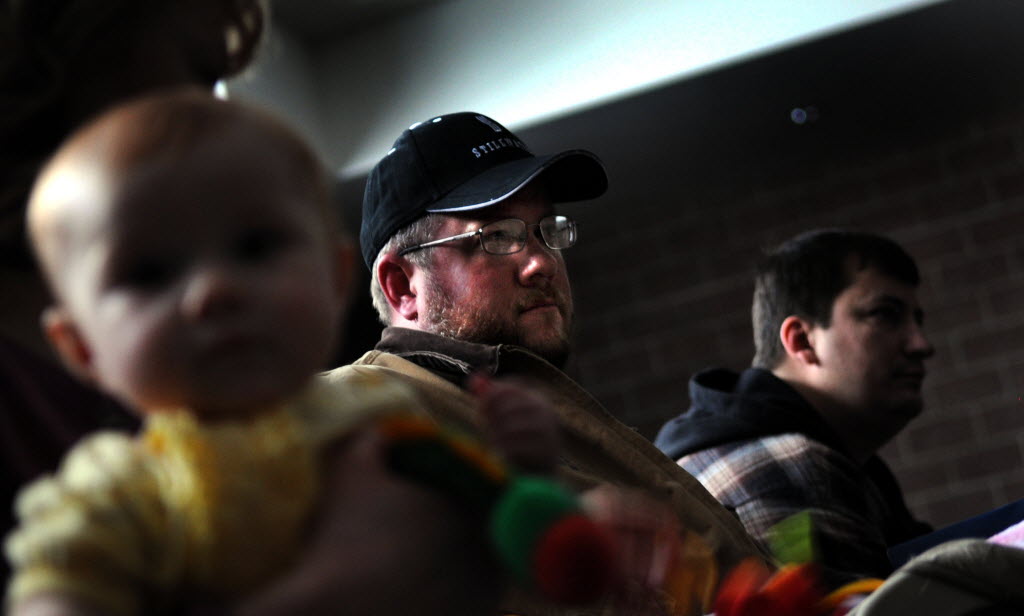 “I would prefer to stay here,” said Mark Miller, of Kingston, Idaho, along with his wife, Heidi, and their baby daughter, Naomi, during a job fair at Wallace Junior/Senior High School on Thursday. Miller works in Lucky Friday Mine’s milling operation. Becky Kramer/SR story here. (SR photo: Kathy Plonka)