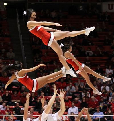 The Utah Utes cheerleaders perform during a time out in the first half of an NCAA college basketball game against Arizona Thursday in Salt Lake City. You write the cutline. (AP Photo/Colin E Braley)