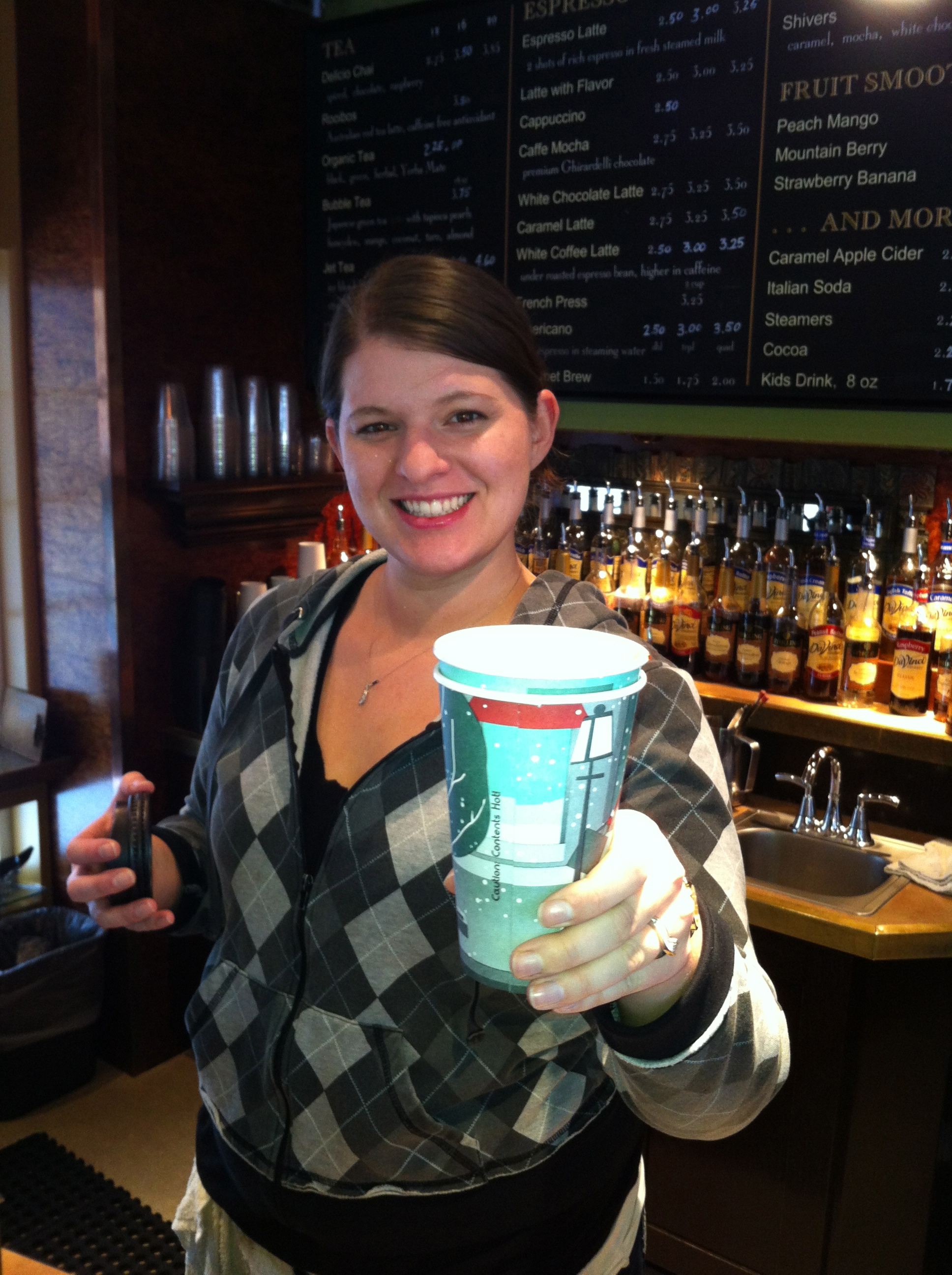It’s cold out there. So I can’t think of a better way to begin the day than with a brisk workout and a cup of good coffee. I recently ran down a list of some of my favorite Spokane coffee shops, so let me add another: Caffe Delici o. It’s pictured above, with Mel (short for Melissa) holding my signature drink: grande Americano, double cup, extra room (and, yes, I take the extra cups home and reuse them).