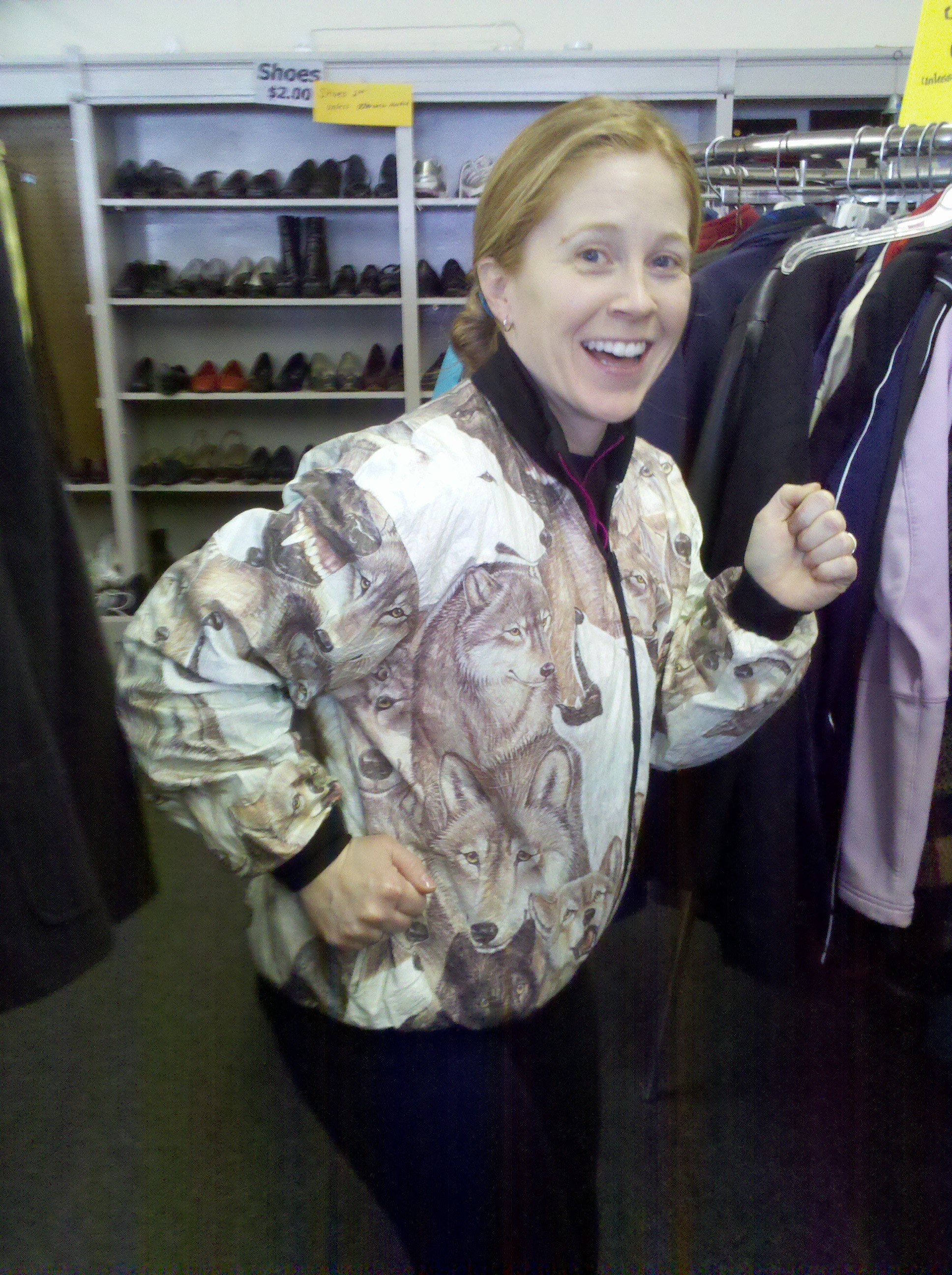Saturday afternoon Amanda and I strolled up Perry Street (after a rib-sticking breakfast with Michelle at the Perry Street Cafe — hence the few extra pounds referenced above) and walked into Windfall Thrift Store. Besides having amazing prices ($2 shoes; $1 sweatshirts; $2.50 jeans; $6 winter coats; BOGO $1 books …) and friendly ladies at the front counter, they have zingers that’ll separate you from the pack (hence the awesomeness referenced in the photo).