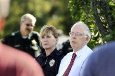 (2009 SR file photo: Tony Stewart, right, and Sgt. Christie Wood speaks to media about racist literature)