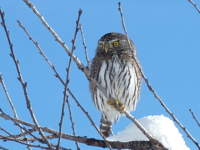 Birder Teri Pieper of Twisp used her eagle eyes to spot this little guy as she skinny-skied behind friends who had swooshed past the owl in the brush just above their heads without seeing it. She was skiing near Sun Mountain Lodge on the Methow Valley Sport Trails Association trails.