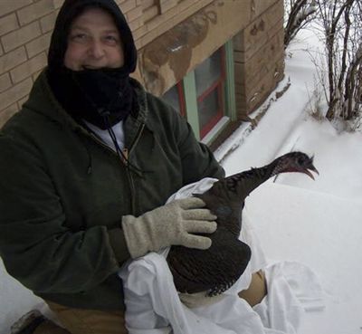 John Chaney shows off a turkey responsible for a break-in at a public library Sunday in Deadwood, S.D. Chaney and Sgt. Ken Mertens captured the turkey in a blanket and let it free after it crashed through a window and flew around the aisles that morning. You write the cutline. (AP Photo/Deadwood Police Department)