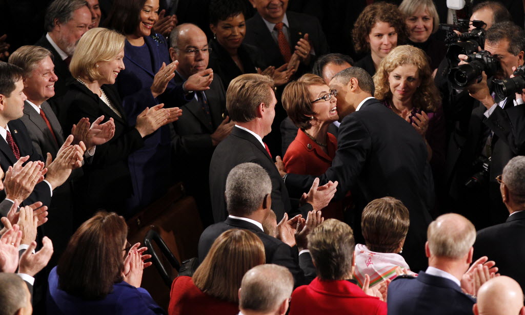 President Barack Obama greets retiring Rep. Gabrielle Giffords, D-Ariz. on Capiotl Hill in Washington, Tuesday, prior to delivering his State of the Union address. Story here. (AP Photo/J. Scott Applewhite)