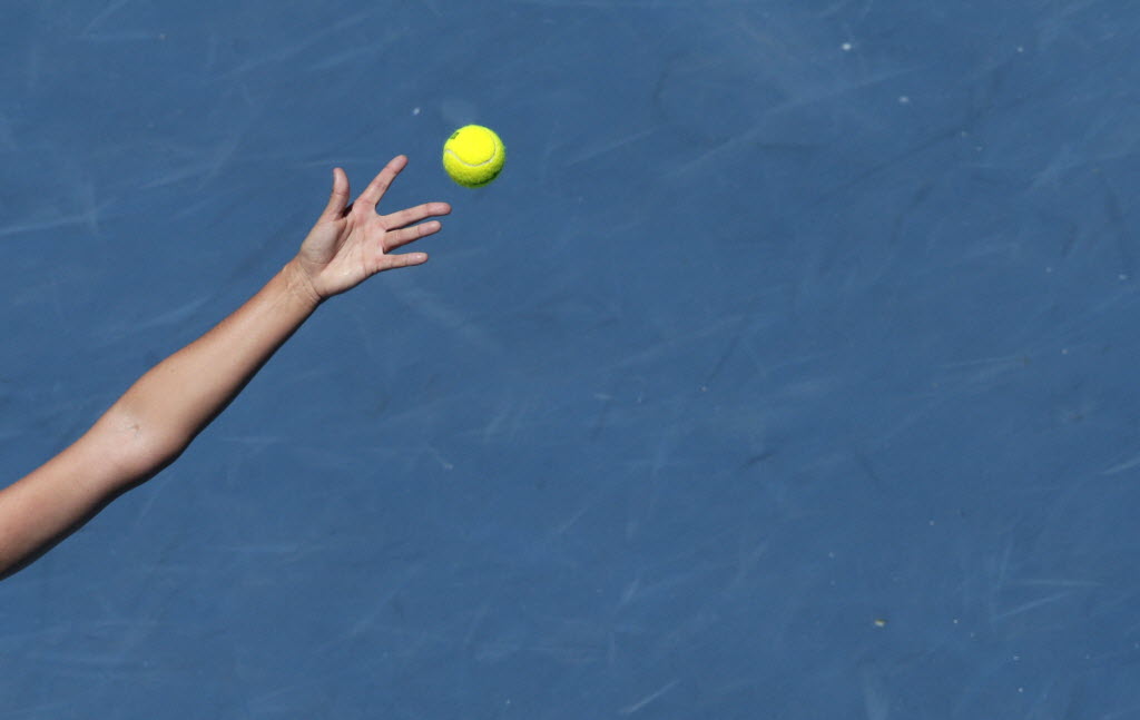 Maria Sharapova of Russia serves to compatriot Ekaterina Makarova during their quarterfinal at the Australian Open tennis championship, in Melbourne, Australia, earlier today. (AP Photo/John Donegan)