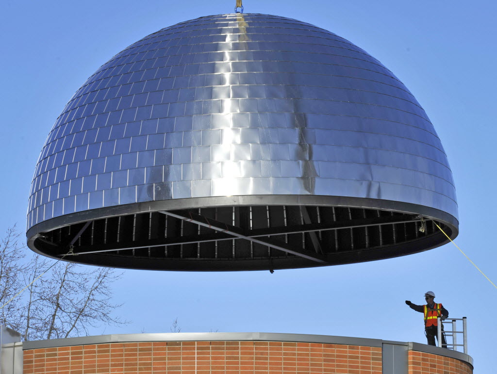 Dave LaFountaine, project supervisor for Burton Construction, guides in the new Spokane Falls Community College planetarium dome on the school’s campus Wednesday in Spokane. The dome, built by Burton Construction, weights 17,000 pounds and is 30 feet in diameter. Jim Camden SR story here. (SR photo: Dan Pelle)