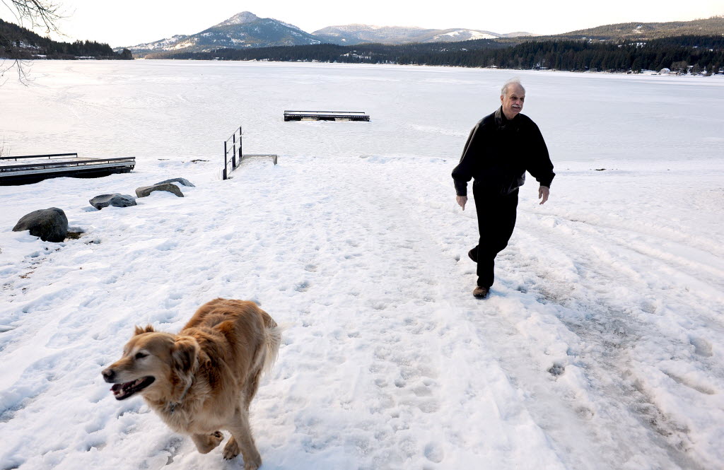 “We love this lake,” said Chuck Gladish as he walked with his dog Gypsy near Cocolalla Lake on Thursday. The Idaho Legislature will likely vote this morning to approve minimum water levels for the lake. Gladish is president of the lake homeowners association, which spearheaded the move. Betsy Russell SR story here. (SR photo: Kathy Plonka)