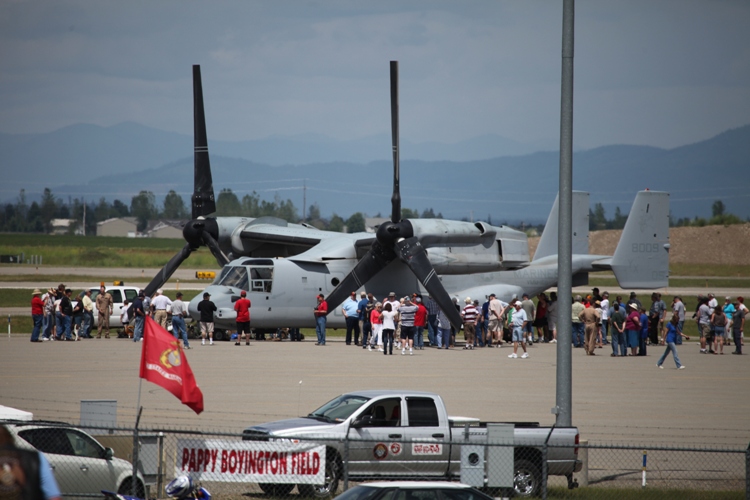 The visit of the Marine Corps Osprey drew a large crowd to Pappy Boyington Field at the Coeur d’Alene Airport Saturday. Since the name change to Boyington Field, promoted by then Commissioner Rich Piazza, several Marine Corps aircraft have visited Pappy Boyington Field. (Duane Rasmussen photo special to Huckleberries Online)