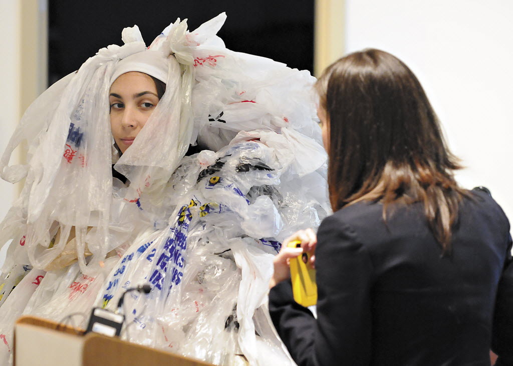 Selin Nurgun, left, also known as the “Bag Monster”, is barely visible through her plastic bags as she appears during a news conference with Sarah Higginbotham, state director of Environment for Oregon, at the Benton County Public Library in Corvallis, Ore., this morning. Story here. (AP Photo/Corvallis Gazette-Times, Amanda Cowan)