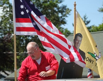 Jeff Ward of the Reagan Republicans rides the 4th of July Parade route with a cutout of Ronald Reagan. (Duane Rasmussen photo special to Huckleberries Online)