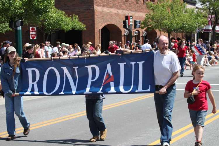 A Ron Pauler named Jude, according to HucksOnline commenter Jennifer Locke, followed the Kootenai County Republican Central Committee parade float, which had Reps. Bob Nonini & Vito Barbieri on board, as well as House District 3 GOP legislative nominee, Ron Mendive. (Duane Rasmussen photo special for Huckleberries Online)